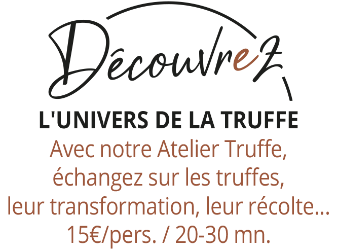 Et vous aurez aussi la possibilité de faire une visite interactive de 20 à 30 mn en laboratoire pour un ATELIER TRUFFE (15€/pers. sur réservation, groupe jusqu’à 10) pour échanger sur les truffes, leur transformation, leur récolte, et les produits dérivés proposés sur le marché.